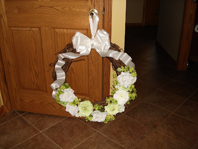 First I made two matching bows with the ribbon I used to make our pew bows. I actually remembered to take pictures of the whole process so I can share with you a How To Make A Pretty Bow tutorial later on this week. I made sure to leave the tails long on both so they could come down the sides of the wreath.